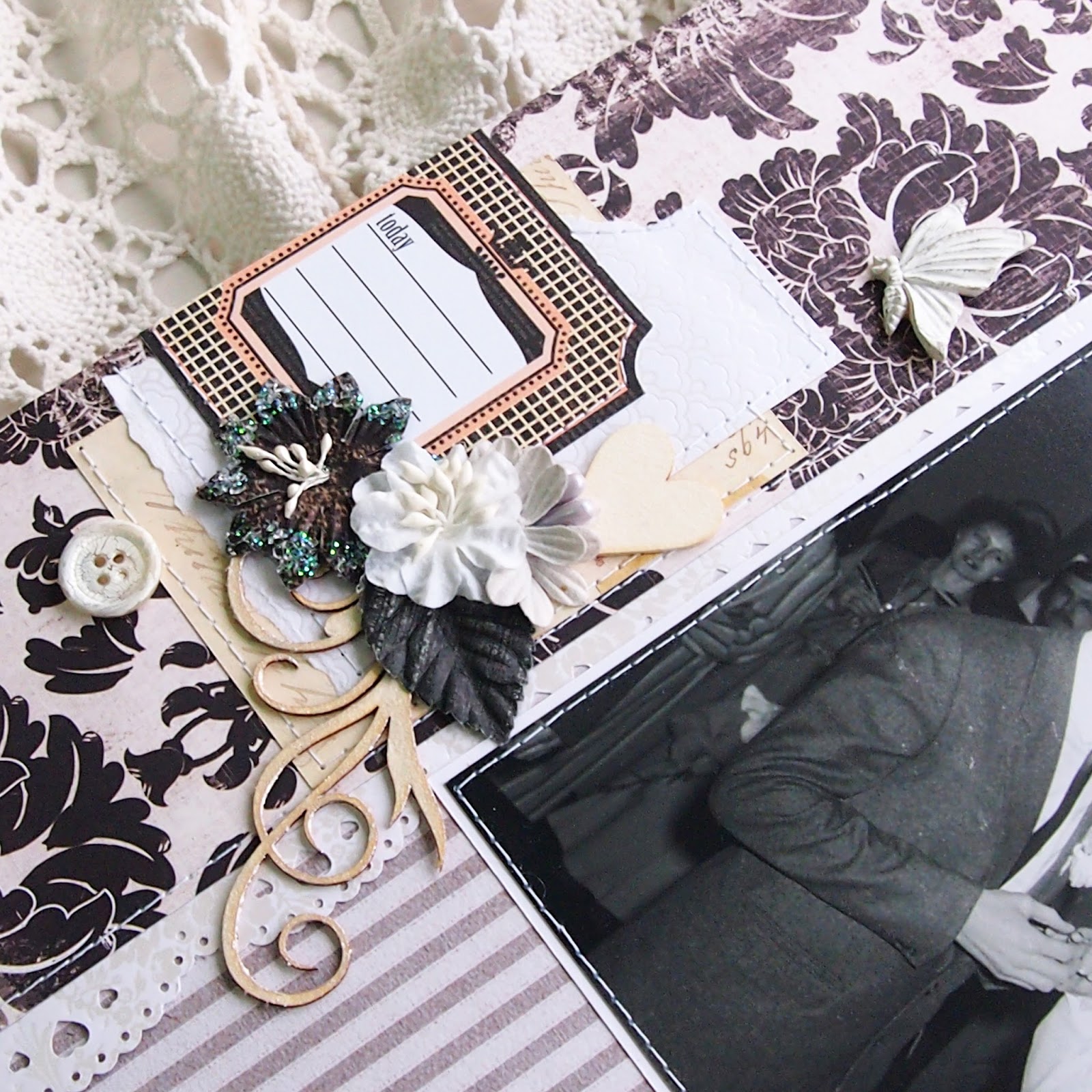 В этом альбоме я решила по-новому для меня подойти к оформлению страничек. Все фотографии, которые требовалось оформить, черно-белые, сделанные во время церемонии бракосочетания, достаточно однотипные, поэтому я выбрала вариант деления странички на фоновую часть и оформленные поля. Результат мне очень понравился!